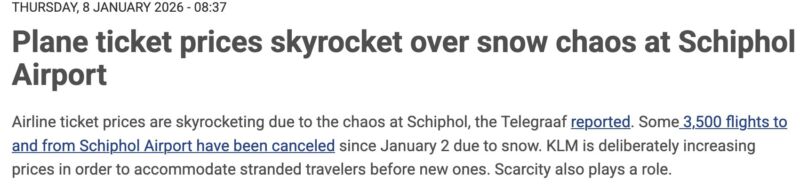 KLMがスキポール空港のキャンセル続出につき、移動できずに困っている人たちを先に救済するべく航空券価格を釣り上げているとのこと。