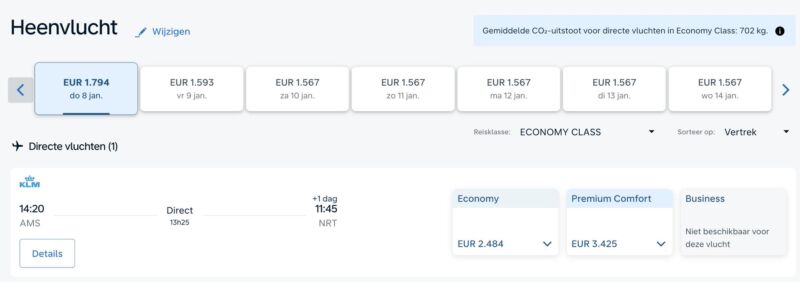 ちなみに今日と明日のAMS-NRT直行便はエコノミーライトで2484ユーロ(約45万円)